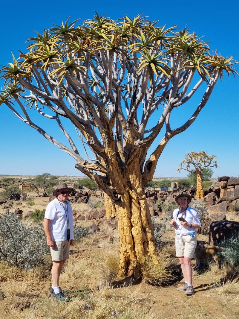 Uli bewegte regelmäßig die Scheibenwischer, bei Linksverkehr ein bisher unbekanntes Phänomen. Aber er hat ja noch ca. 4000 km zum Üben. Einen kurzen Stopp haben wir im Köcherbaumwald eingelegt. Ein illustres Plätzchen mit 2 Hunden, einer Krippe, Köcherbäumen, einem spektakulär aussehenden Käfer und uns. Aloe Dichotoma heisst der Köcherbaum, eine Sukkulentenart, die gerne mal 300 Jahre alt ist. Danach fuhren wir zu unserer Guestfarm direkt nach Keetmanshoop.