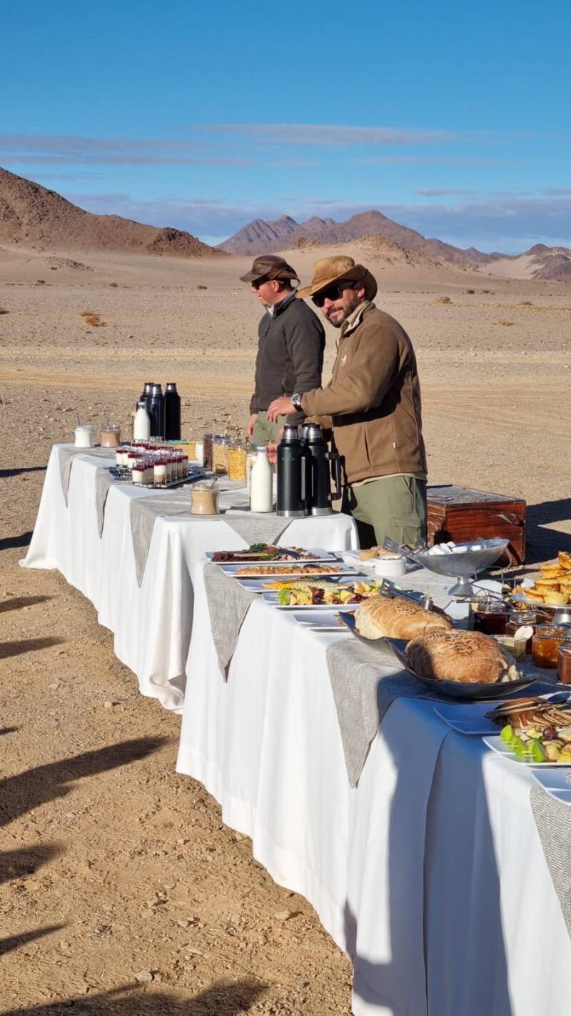 Nach einer Stunde begann das Landen, sehr sanft und völlig ohne Erschütterung landeten wir wieder auf der Erde. Jetzt gings zum Champagnerfrühstück in die Wüste. Die Tische waren liebevoll vorbereitet und das Buffet vom Feinsten. Spezialitäten aus Namibia und Champagner, was wünscht man sich mehr?