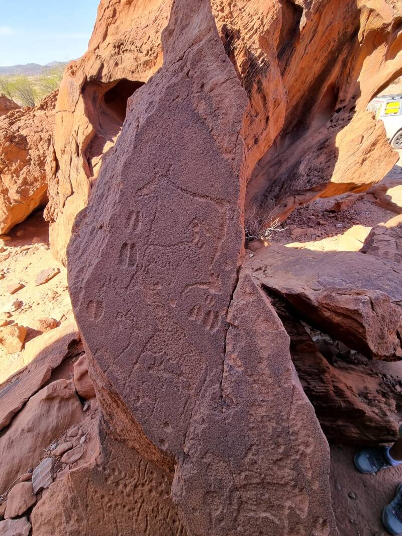Heute morgen sind wir nach einer 2 h Fahrt im Damaraland angekommen. 34 Grad Celsius sind schon wirklich anstrengend. Wir fuhren zunächst zu den Twyfelfontein Felsgravuren. Diese Gravuren sind etwa 6000 Jahre alt. Es ist eine Art Nachrichtensystem, bei der Kinder die Erfahrungen von Ihren Stammeskollegen nähergebracht bekamen, es handelt sich um eine Art Lehrmaterial. Welche Tiere hier leben, wo es Gefahren gibt und in welcher Richtung die nächste Wasserstelle ist, wurde so weitergegeben. Die Tiere auf der Felsgravur schauen in die Richtung der Wasserstelle. Ausserdem wurde die Jagd gelehrt.